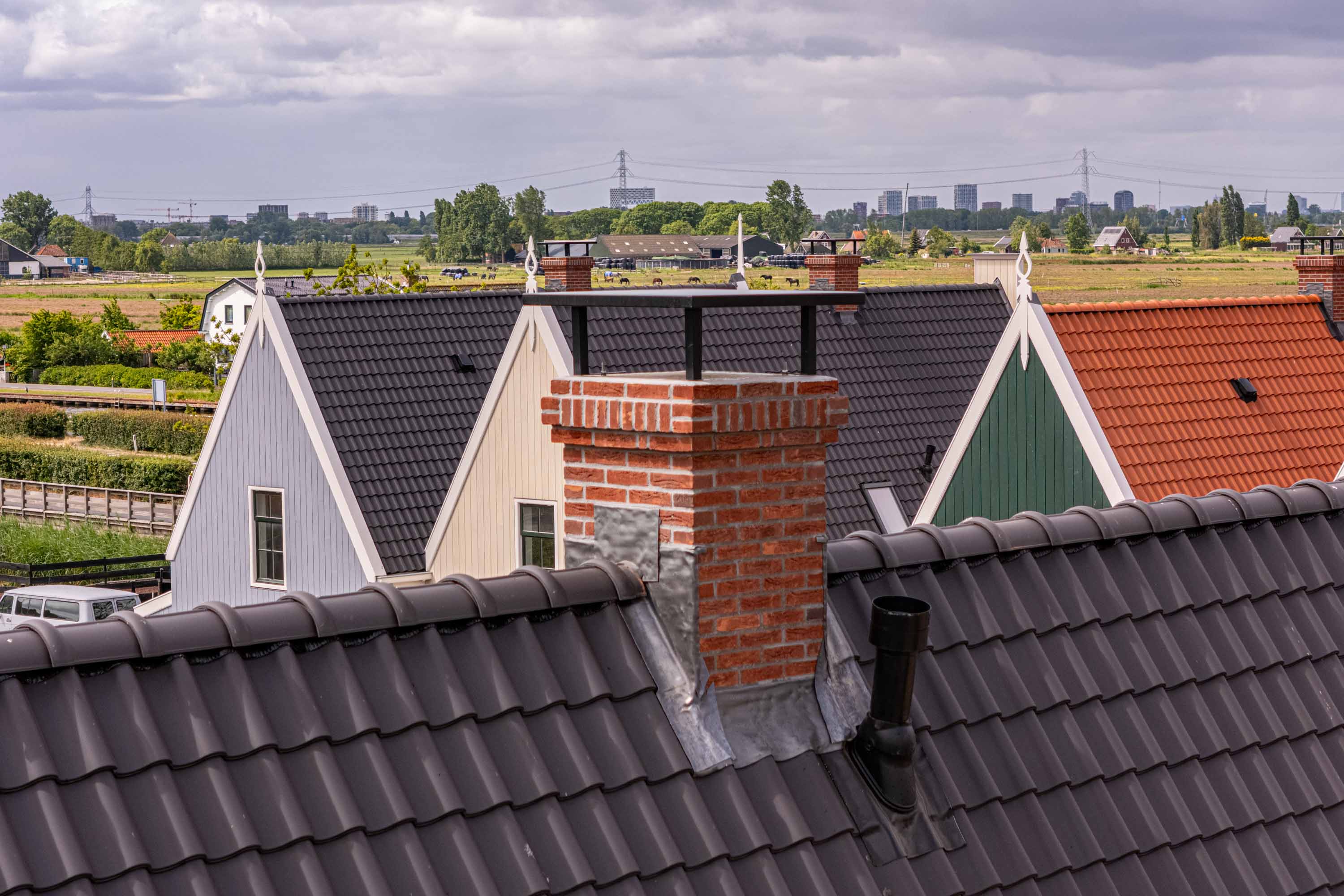 Gespachtelde schoorsteen op rieten dak in Alphen