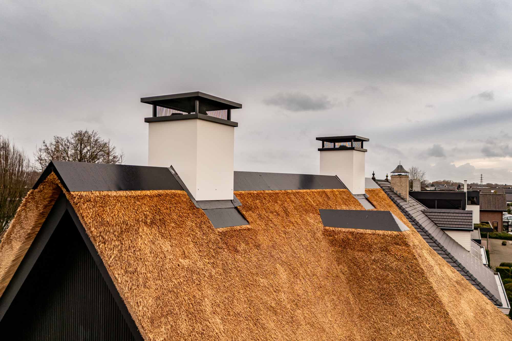 Luxe villa met rieten dak met RVS schoorstenen