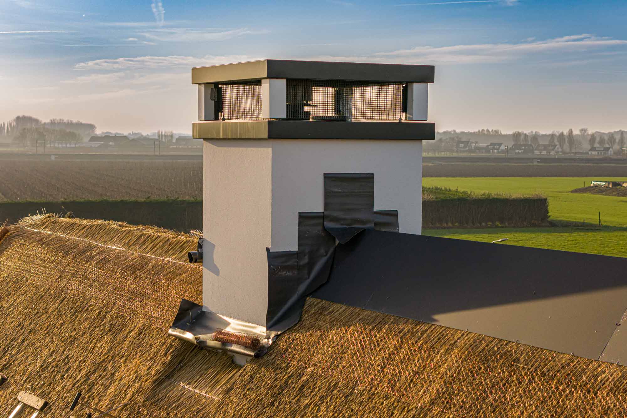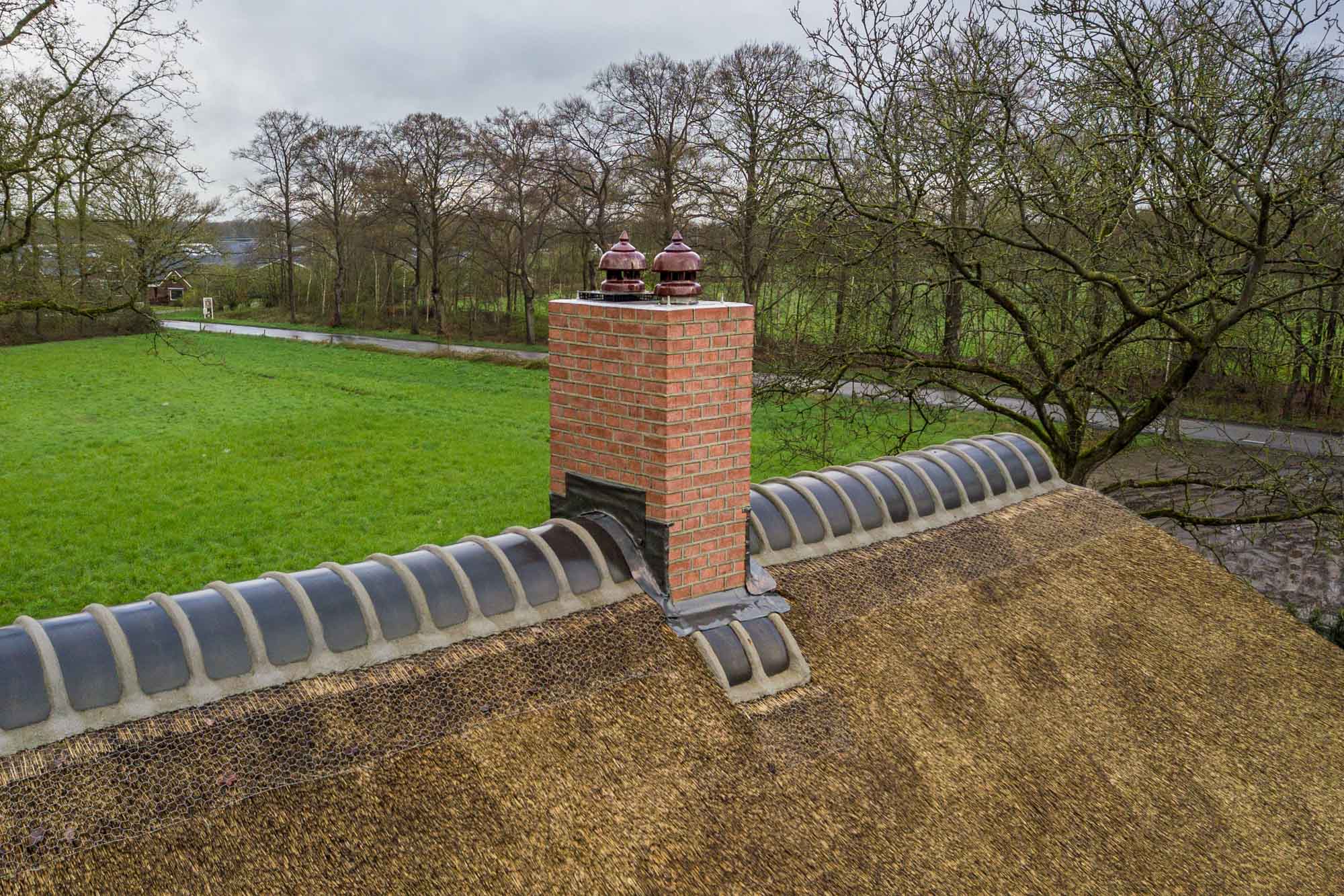Gespachtelde schoorsteen op rieten dak in Alphen
