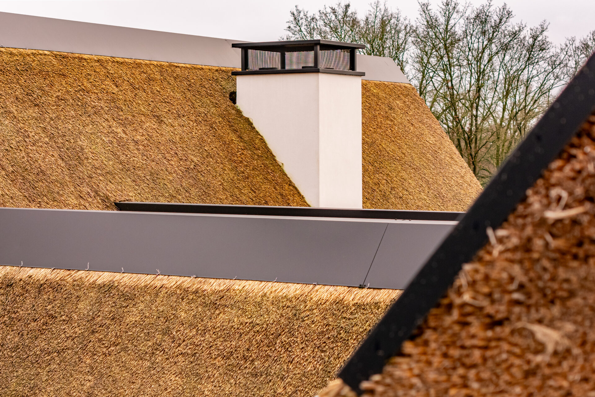 Gestucte schoorsteen op villa met rieten kap in Kootwijkerbroek